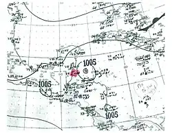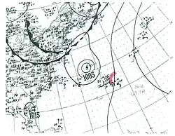 The northern end of a trough developed into a tropical depression just north of the Berry Islands in the Bahamas around 00:00 UTC on September 13. It attained tropical storm intensity six hours later and attained peak winds of 50 mph (85 km/h) by 18:00 UTC as it moved north-northeast. The cyclone lost tropical characteristics by 12:00 UTC on September 15 while positioned about 95 mi (155 km) south-southeast of Nantucket and subsequently tracked across Nova Scotia and Newfoundland. It was last observed over the northern Atlantic on September 17.[8] Impacts from the storm were relegated to heavy rainfall along the shores of Nantucket, "extraordinarily high tides" northeast from Cape Cod, as well as gale-force winds and 1.2 in (30 mm) of rainfall from the post-tropical cyclone within Nova Scotia.[10][12]