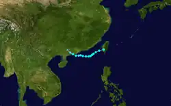 Pearl originated from a tropical depression located south of the Northern Mariana Islands on July 1. Developing into a tropical storm several hours later, further development occurred as Pearl tracked northwards, with it becoming a typhoon the next day. As a result, on July 4, Pearl peaked as a modern-day very strong typhoon with sustained winds of 90 knots (105 mph) Several days later, on July 6, Pearl made landfall 40 miles east of Shanghai, veering to the northwest. Weakening occurred after this landfall, and by the time Pearl struck what is now South Korea, it was a minimal tropical storm. A weakening Pearl tracked northwards before dissipating in Manchuria on July 8.[6]