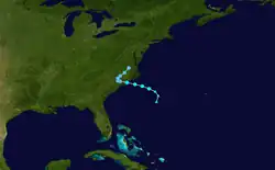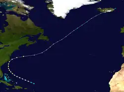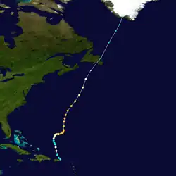 A tropical wave developed into a tropical storm east of Puerto Rico on September 3. It moved northward and strengthened to a hurricane later that day, but then weakened to a strong tropical storm the next day. At the same time, the system halted its forward motion and began to drift eastward. Early on September 5, it re-intensified into a hurricane, and it became a major hurricane on September 6. The storm turned to the north on September 7 and passed about 65 mi (105 km) east of Bermuda on September 8.[8][6] The hurricane weakened as it accelerated northeastward over cooler waters, and became extratropical on September 10 near Atlantic Canada. Shortly after becoming extratropical, it passed over Newfoundland, and ultimately dissipated on September 11 near southwestern Greenland.[8]