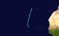 A tropical depression formed to the east of the Lesser Antilles on August 30. It moved steadily west-northwestward,[8] passing over Barbados as a weak tropical storm.[6] Seven people drowned on the island and 27 houses were destroyed in Bridgetown.[9] On Dominica, winds uprooted some trees, while rough seas damaged roads, jetties, and Landings.[15] After entering the Caribbean Sea on September 1, hostile conditions weakened the storm, and the third tropical cyclone of the season degenerated into a tropical wave on September 3 to the south of the eastern tip of the Dominican Republic.[8]