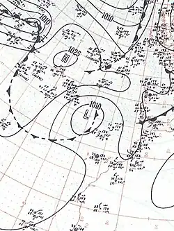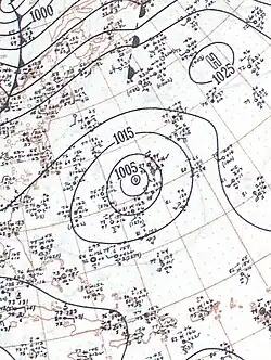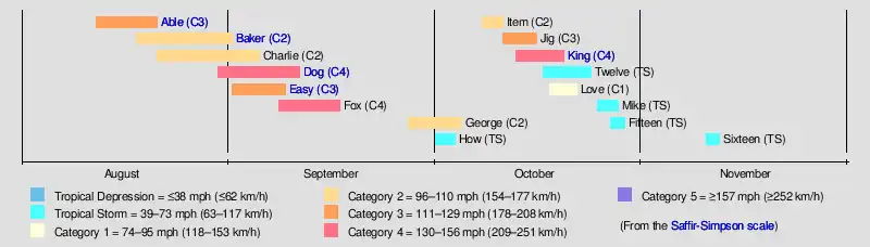The season officially began on June 15 and ended on November 15; these dates conventionally delimit the period of each year when most tropical cyclones form in the Atlantic basin. This season was the first time that the United States Weather Bureau operated with radar technology to observe hurricanes 200 mi (320 km) away from land. Although the season began on June 15, tropical activity typically does not begin before August.[5] The tropics remained tranquil through early August, and the U.S. Weather Bureau noted that the season had been "remarkably quiet".[6] The inactive period ended on August 12, when the first tropical storm developed east of the Lesser Antilles. This storm received the name "Able" as part of the Joint Army/Navy Phonetic Alphabet.[6] (The same alphabet was also used in the 1951 and 1952 seasons, before being replaced by female naming in 1953.)[7]