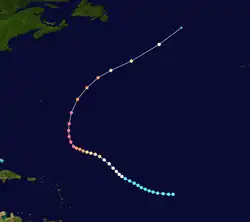 After passing through the Leeward Islands, the hurricane turned to a northerly drift with continued intensification. On September 5, it attained wind speeds that would be equivalent to a Category 4 hurricane on the present-day Saffir-Simpson scale, with sustained winds of 145 mph (233 km/h). Operationally, the wind intensity value was estimated by Hurricane Hunters at 185 mph (298 km/h) when the hurricane was located about 450 mi (720 km) south-southwest of Bermuda;[6] this estimate is now believed to have been an overestimation of the peak winds in Hurricane Dog, though the storm produced enormous wave heights at sea.[9]