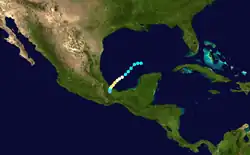On October 4, a trough was present in the western Caribbean Sea, and was possibly a tropical cyclone. Moving northwest, the system crossed the Yucatán Peninsula and became disrupted, while also associating with a cold front. It emerged into the Gulf of Mexico on October 7 and became more defined. On the next day, the system developed into Tropical Storm Item off the northwest coast of the Yucatán Peninsula. The storm moved to the southwest and intensified into a hurricane on October 9, reaching peak winds of 105 mph (169 km/h) on the next day based on Hurricane Hunters observations. It is possible that Item was stronger, due to the storm's small size but lack of direct observations. On October 11, the hurricane made landfall at 04:00 UTC near Nautla, Veracruz, with peak gusts of 110 mph (180 km/h).[9] The hurricane quickly dissipated over land.[6][9]
