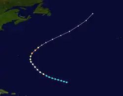 Maintaining peak intensity for about 18 hours, Dog began a weakening trend as it made a sharp turn to the west. It accelerated to the north on September 10, and two days later Dog passed within 200 mi (320 km) of Cape Cod.[6][9] Newspapers attributed heavy rainfall in the Mid-Atlantic states—which resulted in five deaths—to the hurricane.[24] Further north, the hurricane killed 12 people in New England, and produced a total of $2 million (1950 USD$, 26.1 million 2025 USD) of property damage.[6] Twelve others died in two shipwrecks off the coast of Canada.[25] The hurricane later became a strong extratropical cyclone, maintaining hurricane-force winds while passing south of Nova Scotia and eventually hitting Scotland with hurricane-force gusts on September 18.[9]