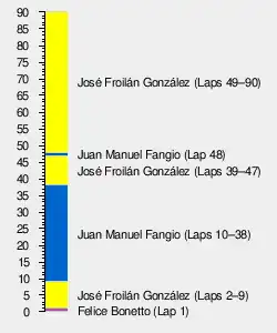 The Alfa Romeos of Fangio and Farina pitted twice for fuel, owing to the awful fuel consumption of their cars. They were doing 1+1⁄16 miles to the gallon, and needed to take on 90 gallons for every stop. Both drivers needed to stop twice, and, owing to the lengthy, minutes-long pit stops of Formula One in 1951, the more fuel efficient Ferrari of González (who only needed to make one stop) was able to overtake the Alfa Romeos and pull out a considerable lead.