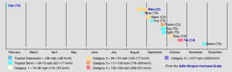 The 1952 Atlantic hurricane season was the last Atlantic hurricane season in which tropical cyclones were named using the Joint Army/Navy Phonetic Alphabet. It was a near normal Atlantic hurricane season, although it was the least active since 1946.[1] The season officially started on June 15;[2] however, a pre-season unnamed storm formed on Groundhog Day, becoming the only storm on record in the month of February. The other six tropical cyclones were named using the Joint Army/Navy Phonetic Alphabet, the first of which formed on August 18. The final storm of the season dissipated on October 28, two and a half weeks before the season officially ended on November 15.[3]