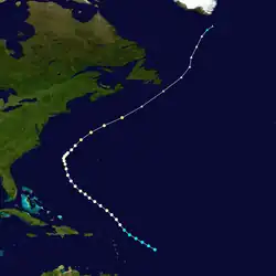 After crossing Cuba, Fox emerged into the Atlantic Ocean with winds of 100 mph (160 km/h), crossing central Andros and turning eastward though the Bahamas.[4] On New Providence, the hurricane dropped 13.27 in (337 mm) of rainfall,[21] Strong winds caused severe crop damage, leaving 30% of the tomato crop destroyed.[1] After briefly restrengthening to a major hurricane, Fox began a steady weakening trend. It turned abruptly to the north-northwest, followed by another turn to the northeast. On October 28, Fox was absorbed by a cold front west-southwest of Bermuda.[4][1]