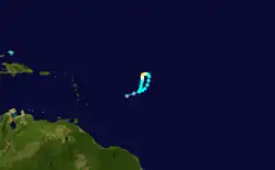 On September 22, a tropical wave moved into the eastern Caribbean Sea,[1] spawning a tropical depression near Hispaniola early on September 24.[4] As it tracked west-northwestward, the low dropped heavy rainfall, peaking at 4.42 in (112 mm) in Christiansted, United States Virgin Islands, as well as 11.9 in (300 mm) in Garzas, Puerto Rico.[15] In Puerto Rico, the rains caused landslides that affected seven towns, notably Ponce, the island's second-largest city.[16] There, at least 14 buildings were destroyed.[17] The floods left more than 1,000 people homeless, 300 of whom took refuge in a Red Cross shelter.[16] Overall, the flooding on the island killed four people and left moderate damage of around $1 million (1952 USD, $11.8 million 2025 USD).[1]