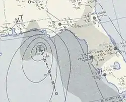 On August 29, a tropical storm developed over southern Florida.[8] While moving through the state, the storm dropped heavy rainfall, reaching 4.67 in (119 mm) at Fort Lauderdale Beach; similar rainfall was observed in the northern Bahamas. Described by one Weather Bureau forecaster as "wide and flat", the storm gradually organized over the western Atlantic Ocean.[20] On August 31, the storm turned to the northwest, with maximum sustained winds of 40 mph (65 km/h). The system weakened to a tropical depression before moving ashore near Savannah, Georgia on September 1. It dissipated that day over land.[8]