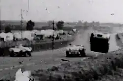On lap 35, Hawthorn and Fangio were racing as hard as ever. In his biography, Hawthorn said he was "momentarily mesmerized by the legend of the Mercedes superiority ... Then I came to my senses and thought 'Damn it, why should a German car beat a British car.'"[8][9] The lap before, Hawthorn's pit crew had signalled for him to come in the next lap. He had just lapped Levegh (running sixth) after Arnage (one of the corners of the race track) and was determined to keep Fangio at bay for as long as he could.[10] Coming out of the Maison Blanche portion of the course, he rapidly caught Lance Macklin in his Austin Healey 100S, who had seen him and moved over to the right to let him pass. Putting another lap on Macklin coming up to the main straight, Hawthorn then raised his hand to indicate he was pitting and pulled across to the right (from Hawthorn's testimony).[10][11] What caught Macklin out though was that Hawthorn, using the Jaguar's advanced disc brakes, braked hard enough to slow his Jaguar from such a speed in time.[12][13][14][15]