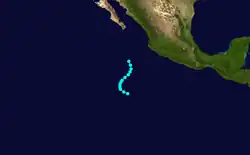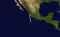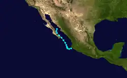 In early October, the remnants of Hurricane Janet entered the Pacific Ocean, which later re-organized into the fifth tropical storm of the Pacific hurricane season.[1] On October 1, the storm began to curve northwestward due to a ridge over Texas. Over the following days, however, a shortwave over the United States West Coast forced to the storm to the north and then east.[2] The tropical storm maintained the same intensity throughout its existence, before making landfall on Baja California Sur at 0600 UTC on October 3. The disturbance crossed back into the Gulf of California, where it dissipated the following day.[3] The remnants of the cyclone later moved into Sonora. In the United States, rainfall was spread throughout areas of Arizona and New Mexico. Stations in Tatum and Lovington, New Mexico, recorded peak rainfall totals in excess of 3 in (76 mm).[2]