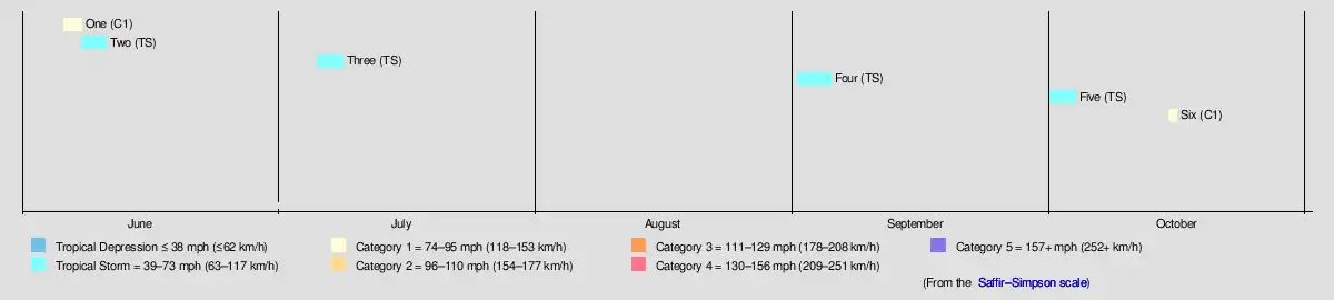 Before the satellite age started in the 1960s, data on east Pacific hurricanes is extremely unreliable. Most east Pacific storms are of no threat to land. Six tropical systems were observed this season.