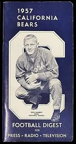 The 1957 California Golden Bears football team was an American football team that represented the University of California, Berkeley in the Pacific Coast Conference (PCC) during the 1957 college football season. In their first year under head coach Pete Elliott, the Golden Bears compiled a 1–9 record (1–6 in PCC, seventh), and were outscored 176 to 109.[1][2] Home games were played on campus at California Memorial Stadium in Berkeley, California.