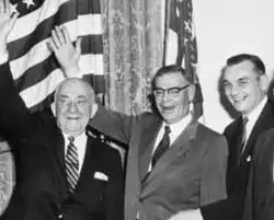 Three of the four candidates for U.S. Senate celebrate Alaska statehood. From left to right: Ernest Gruening , Bob Bartlett , and Mike Stepovich .