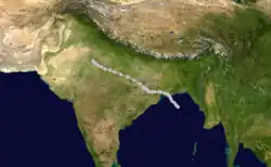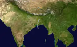 Large portions of India were affected by rains from the depression, with Orissa and Madhya receiving the heaviest rains.[15] According to Prime Minister Jawaharlal Nehru, up to 1,000 mm (40 in) of rain fell across portions of Orissa. The tremendous precipitation triggered disastrous floods that killed at least 65 people.[17] Continued rains over the next two weeks exacerbated the situation and by August 30, an estimated 2.5 million people were homeless.[18] Most affected were areas around the Mahanadi River and its tributaries where flood waters reached 3.7 m (12 ft) in depth. At least 85 villages were reportedly destroyed. Orissa government officials described the disaster as "the worst in living memory."[17] Rail lines and roads were severely damaged across the state, hampering initial relief efforts.[17] A total of 1.87 million acres of crops were flooded and overall damage amounted to 112 million.[19]