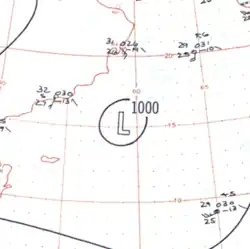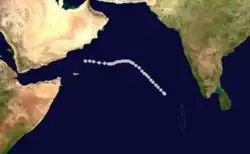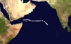 On May 10, an area of low pressure was identified over the Arabian Sea roughly 400 km (250 mi) to the northwest of the Maldives. Moving northwestward, it gradually became more concentrated,[4] becoming a depression by the evening of May 12.[5] After turning more toward the west,[4] the system continued to slowly deepen. On May 14, the S.S. Kampala sailed into the system, encountering 55 km/h (35 mph) winds and rough seas. Over the following two days, the depression intensified into a cyclonic storm, with gale-force winds extending 150 km (90 mi) from the center. During the overnight hours of May 16 through 17, the SS Mohammedi sailed almost directly into the center of the cyclone, reporting a barometric pressure of 974 mbar (hPa; 28.76 inHg) and 9.1 m (30 ft) waves. Several other vessels, such as the S.S. Saudi and S.S. Exchequer, encountered the storm. Both ships reported hurricane-force winds, and the latter endured seas as high as 15.2 m (50 ft) early on May 18. Later that day, the storm weakened so rapidly the crew of the S.S. Exchequer were able to watch the pressure on their barometer actively rise.[5] The storm continued westward, moving ashore Al Mahrah Governorate in eastern South Yemen as a severe cyclonic storm on May 18, before dissipating. The next Yemeni landfall would not occur again until 2015 with Cyclone Chapala.[6][5]