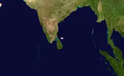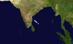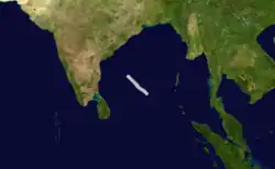 On November 5, an area of low pressure was identified over Lakshadweep.[34] Tracking generally northwestward,[35] it gradually organized into a depression by November 7. No further development took place over the following days and the system eventually degraded into a remnant low on November 10. Though the storm itself did not impact land, associated moisture combined with a low over the Bay of Bengal to produce heavy rains across Madras State and nearby islands from November 5 to 10.[34]