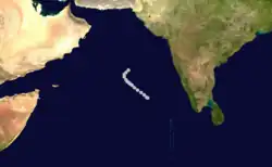 On November 14, an area of low pressure formed to the west of Lakshadweep. Tracking generally westward, it eventually developed into a depression three days later. Gradual intensification took place over the following two days, with the system becoming a cyclonic storm on November 19. On November 20, the system attained its peak intensity with winds of 75 km/h (45 mph) and a minimum pressure of 994 mbar (hPa; 29.35 inHg). Continuing westward, the cyclone entered the Gulf of Aden on November 22 before becoming nearly stationary. During this time, it weakened to a depression before dissipating the following day.[37]