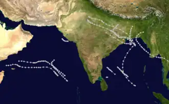 The 1960 North Indian Ocean cyclone season featured two deadly tropical cyclones that collectively killed approximately 20,000 people collectively in East Pakistan (present-day Bangladesh). The Indian subcontinent divides the North Indian Ocean into two areas: the Bay of Bengal to the east and the Arabian Sea to the west. The official Regional Specialized Meteorological Centre for this basin is the India Meteorological Department (IMD), while the Joint Typhoon Warning Center releases unofficial advisories. On average, five storms form in the North Indian Ocean every season with dual peaks in activity during May and November.[1] Cyclones that occurred between 45°E and 100°E were included in seasonal records by the IMD.[2]