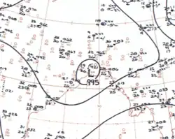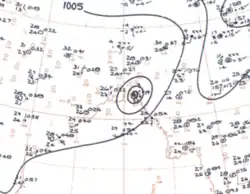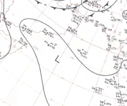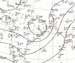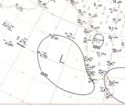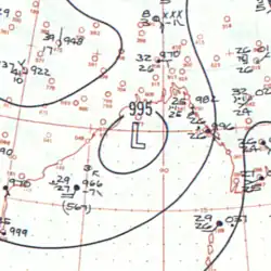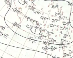 On May 25, an upper-level low-pressure system developed over the northern Bay of Bengal. The following day, a surface low formed in association with this feature. By May 27, the low further consolidated into a depression while situated 285 km (175 mi) south of Calcutta, India.[7] Tracking northward,[8] it intensified into a deep depression before making landfall on the Sundarbans region of West Bengal—near the border of East Pakistan—early on May 28. Though it was classified a deep depression, stronger winds of up to 75 km/h (45 mph) were reported from Sagar Island. Based on measurements from nearby stations, it is estimated that the system attained a minimum pressure of 988 mb (hPa; 29.18 inHg) just as it moved ashore. Once inland, the system quickly weakened and accelerated northeastward. It later dissipated over Assam on May 30.[7]