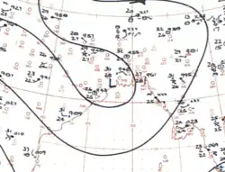 On October 26, a trough formed over the south Andaman Sea and extended into the southern Bay of Bengal. By October 28, the system consolidated into a depression as it moved northwestward. Steadily intensifying, several ships encountered the storms increasing winds as it moved northward in the Bay. On October 30, it attained gale-force winds and further became a severe cyclonic storm early the next morning. During the evening of October 31, the IST Barisal recorded winds of 130 km/h (80 mph), indicating that the system had acquired a core of hurricane-force winds. The maximum winds of this system is unknown, though reports indicated that winds peaked between 150 and 215 km/h (90 and 135 mph).[32] NOAA estimated that the storm peaked with one-minute sustained winds of 195 km/h (120 mph) and a pressure of 966.7 mbar (hPa; 28.55 inHg).[26] The storm soon made landfall with great intensity near Noakhali, East Pakistan, just three weeks after the previous storm devastated the country.[32] Once onshore, cold, dry air quickly wrapped around the backside of the cyclone. Within four hours of landfall, little rainfall was reported near the storm's eye.[26] The cyclone rapidly weakened and dissipated the following day over the Lushai Hills.[32]