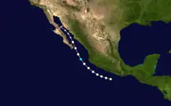 Estelle formed on August 29 south-southwest of Guatemala. The storm moved west-northwest, paralleling the coast of Mexico as an 85 mph (135 km/h) hurricane before becoming extratropical on September 9.[2] The remnants of Estelle brought heavy rainfall across southern California with rainfall totals reaching 3.1 inches (76.2 mm) in Julian.[7]