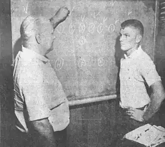 ![]() Head coach Jim Freeman diagrams a play for quarterback Phil Sullivan, 1961 | |