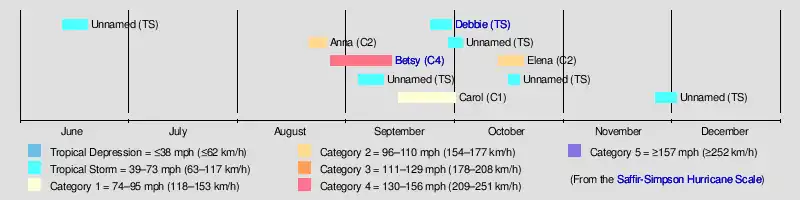 Season activity began with the formation of an unnamed tropical storm over the southern Gulf of Mexico on June 13.[4] There were no other tropical storms in the Atlantic basin until the latter part of August, when hurricanes Anna and Betsy formed. The latter developed on August 27 and eventually became the most intense tropical cyclone of the 1965 season, peaking as a Category 4 hurricane with maximum sustained winds of 140 mph (225 km/h) on September 2.[8]
