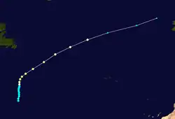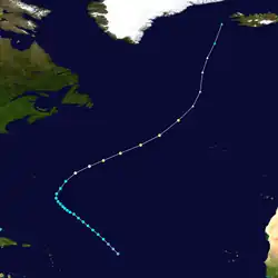 A cold front moved eastward from North America into the western Atlantic Ocean on August 28. An extratropical low developed on August 31 over the north Atlantic, which degenerated into a trough three days later. On September 4, another extratropical storm developed, located about 800 mi (1,285 km) south of Newfoundland. The system attained gale-force winds a day later, and turned westward on September 6, steered by a building ridge to the north. On September 7, the storm transitioned into a tropical storm, after its wind field became more symmetrical. Later that day, the storm attain winds of 60 mph (95 km/h), recorded by nearby ships. The storm turned to the east and northeast, crossing over its former path. On September 10, the tropical storm again transitioned into an extratropical storm, which later passed southeast of Newfoundland. The storm moved across the northern Atlantic Ocean, dissipating on September 13 southwest of Ireland.[4]