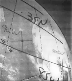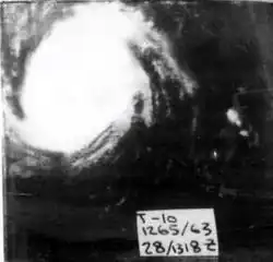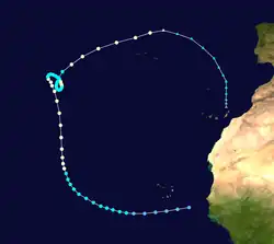 TIROS imagery indicated a very weak circulation near 12°N, 40°W on October 11. Ship reports on the following day indicated a somewhat more organized circulation.[7] As a result, it is estimated that the final tropical depression of the season at 1200 UTC on October 12, while located about midway between Cape Verde and the Leeward Islands. Initially, the depression remained disorganized while tracking northwestward. However, by early on October 14, the depression strengthened into Tropical Storm Elena. The storm continued to intensify as it headed northwestward, before turning to the northeast late on October 16. Elena became a Category 1 hurricane at 1200 UTC on October 17 and then reached Category 2 status early the next day. Around 1200 UTC, Elena attained its peak intensity with maximum sustained winds of 110 mph (175 km/h) and a minimum barometric pressure of 977 mbar (28.9 inHg). At 0600 UTC on October 19,[8] the storm merged with an approaching cold front near the Azores.[7] The remnants moved rapidly north-northeastward until dissipating near Iceland on October 20.[8]