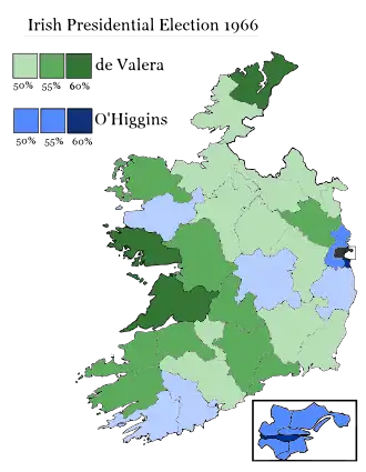 The 1966 Irish presidential election was held on Wednesday 1 June 1966, and was contested between the incumbent president Éamon de Valera, representing Fianna Fáil, and Tom O'Higgins of Fine Gael. De Valera, one of the most prominent figures in 20th-century Irish politics and figurehead of Ireland's old guard, sought a second term at the age of 83, while O'Higgins represented a younger generation seeking political change. The election was notable for its extremely narrow outcome, with de Valera winning by a slim margin of just 10,717 votes (50.5% to 49.5%). The election held symbolic significance, occurring not only on the 50th anniversary of the 1916 Easter Rising (an event in which de Valera had been a prominent leader) but also in the wake of the 1960 United States presidential election, where the young, charismatic Irish-American Catholic John F. Kennedy was the victor. Both events influenced the election and helped shape the narrative that the election was a battle between Ireland's different generations.