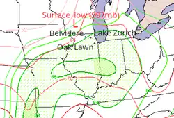 On April 21, a strong jet stream was in place from the Southwestern United States to the Great Lakes region, and a strong 500mb shortwave trough moved northeast from the Southwest region. A surface low developed near the Great Plains and moved eastward along a stationary warm front, which was located between the low center and north of Chicago. Illinois experienced widespread temperatures in the low to mid 70s and dew points in the low 60s Fahrenheit. The jet maximum at 250mb reached 120 knots (140 mph; 220 km/h) over the upper Great Lakes region, with much of northeastern Illinois being placed in the right rear sector, favorable for the development of intense thunderstorms. An existing line of storms that had caused wind damage and several tornadoes in Iowa and Missouri spawned strong rotating supercells as it entered northern Illinois.[2]