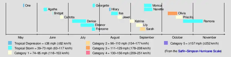 The 1967 Pacific hurricane season started on June 1 and ended on November 30, 1967. The season was of little note except for Hurricanes Katrina and Olivia. Katrina made landfall on the Baja Peninsula, killing at least one and made 2,500 homeless. Olivia made landfall on the eastern side of the Baja Peninsula as a major hurricane—only one of two storms ever to do so. Hurricane/Typhoon Sarah formed in the Central Pacific and reached category 1 strength before crossing over to the Western Pacific.