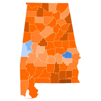 Wallace won his home state in a landslide, receiving 65.86 percent of the vote to Democrat Hubert Humphrey's 18.72 percent, a 47.13-point margin. Republican Richard Nixon, while winning the election nationally, finished a distant third in Alabama with only 13.99 percent, gaining significant support only in a few northern counties with historical Unionist sympathies and higher-income urban areas.[22] Wallace's 65.86 percent of the popular vote would make Alabama not only his best-performing state in the 1968 election, but the strongest-performing state out of any candidate, with only Humphrey's performance in Washington D.C. being stronger.[23]