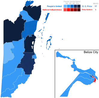 The ruling People's United Party (PUP) won 17 of the 18 seats in the elections, increasing its large majority. Among the opposition only Philip Goldson, leader of the National Independence Party, retained his seat.[1]