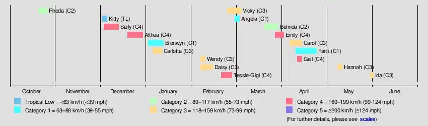 Tropical Cyclone Althea was a Category 4 cyclone when it hit the coast some 50 km north of Magnetic Island and Townsville in North Queensland on 24 December.[1] Althea produced peak gust wind speeds between 123 and 145 miles per hour (197 and 233 km/h). Three people died and property damage was estimated at A$115 million loss (1990 value). On Magnetic Island 90% of the houses were damaged or destroyed.[2] In Townsville houses were lifted from their foundations and most trees stripped of foliage. Althea was also notable at the time, as it had struck a major city.