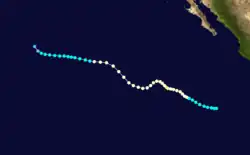 Tropical Storm Hilary developed about 115 mi (185 km) west of Clipperton Island on July 26. Hilary strengthened quickly into a hurricane by July 28 and a recon plane found surface winds of 90 mph (140 km/h) and noted a well-defined eye. The hurricane would peak as a category 2 with sustained winds of 100 mph (160 km/h) on July 30.[3] Hilary weakened slightly as its motion became erratic across the tropical Pacific Ocean. By August 1 the hurricane turned to the northwest towards cooler waters. Hilary weakened into a tropical storm on August 3 after being at hurricane strength for a week.[3] Steady weakening continued over the next four days before dissipating in the Central Pacific.