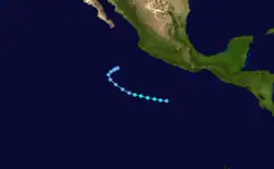 Tropical Storm Jewel formed near Mexico on August 6. Heading out to sea, it strengthened into a 70 mph (110 km/h) tropical storm. It dissipated on August 11.