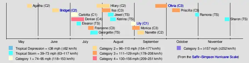 It was an above average pacific hurricane season with 22 tropical cyclones forming, of which 18 became named storms. During the season, 12 storms became hurricanes, of which 6 became major hurricanes by reaching Category 3 or higher on the Saffir-Simpson Hurricane Scale. At the time, this was a single-season record number of storms. This season also had a record 6 systems make landfall: Agatha, Bridget, Katrina, Lily, Olivia and Priscilla.