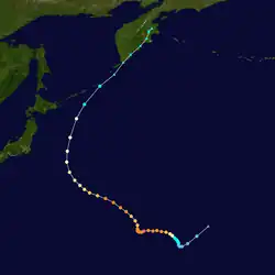 | Virginia | September 1 – 8 | Typhoon | 955 hPa (28.20 inHg) | Japan | Unknown | 56 | ||