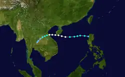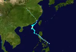 A disturbance in the ITCZ became a tropical depression on July 5. It headed northwest over the Philippines. It intensified into a tropical storm almost immediately after entering the South China Sea on July 8. It then turned north, and erratically drifted and looped for four days. On July 11, Susan became a typhoon. On July 14, Susan moved close to the Taiwan Strait. It made landfall on the coast of Fujian province, and dissipated inland on July 15.[8]