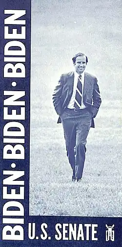 During the summer, Biden trailed Boggs by almost 30 percentage points;[4] however, Biden's energy level, attractive young family, and ability to connect with voters' emotions gave him an advantage over the ready-to-retire Boggs.[8] John Marttila served as one of his consultants and had previously worked for Robert Drinan's campaign for the U.S. House of Representatives.[6][9] Biden's campaign was described as having "no money to speak of" and relied on position papers in newspapers and a few campaign advertisements on the radio.[6] One notable advertisement used by the Biden campaign was a brochure printed in newspaper format that contrasted the world view of the two candidates, e.g. (full page) "To Cale Boggs an unfair tax was the 1948 poll tax"; (opposite page) "To Joe Biden an unfair tax is the 1972 income tax."[10] On November 7, 1972, Biden upset Boggs by a margin of 3,162 votes.[6]