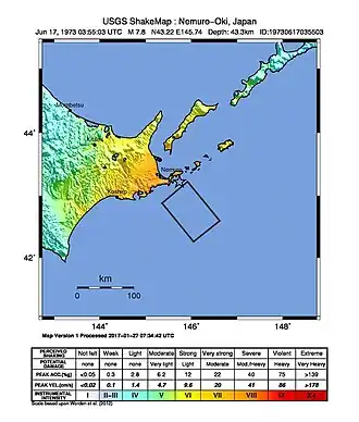 The Nemuro-Oki (Nemuro Peninsula Offshore) earthquake (Japanese: 根室半島沖地震, Hepburn: Nemurohantō oki jishin) in scientific literature, occurred on June 17 at 12:55 local time. It struck with an epicenter just off the Nemuro Peninsula in northern Hokkaidō, Japan. It measured 7.8–7.9 on the moment magnitude scale (Mw ),[4] 8.1 on the tsunami magnitude scale (Mt ) and 7.4 on the Japan Meteorological Agency magnitude scale (MJMA ).[5]