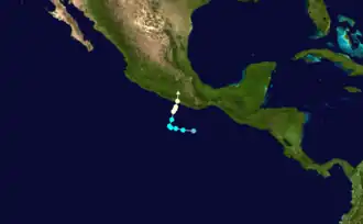 On October 3, an area of disturbed weather was identified several hundred miles southwest of El Salvador. Over the following day, an area of low pressure developed within the disturbance and was subsequently declared a tropical depression. Tracking west-northwestward, the depression eventually intensified into Tropical Storm Patricia on October 6 in light of a significant in convection. The next day, a ragged eye developed and the storm strengthened into a hurricane. Intensification continued through the evening of October 9,[2] at which time Patricia attained its peak intensity with winds estimated at 90 mph (140 km/h).[nb 1][1] Within a day of peaking, the hurricane turned southwestward and weakened. Gradual degradation of the storm took place over the next few days with little convection present over the system by October 11. By then, Patricia had weakened to a tropical depression. On October 15, Patricia was declassified a tropical cyclone as only a low-level circulation devoid of convection remained.[2] The remnants of the storm were last noted on October 17 well to the east-southeast of Hawaii.[6]