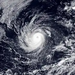 An area of disturbed weather spawned by a tropical wave developed southeast of Acapulco on July 11 and rapidly grew in size.[5] It developed into a tropical depression around 00:00 UTC on July 13 and further into Tropical Storm Gilma six hours later while curving from west-southwest to west-northwest.[5][6] Further organization brought Gilma to hurricane strength around 18:00 UTC on July 15 and major hurricane intensity by 06:00 UTC the next day.[6] By this point, satellite imagery revealed a system with a cloud shield about 920 mi (1,480 km) in diameter and an eye about 15 mi (25 km) wide. Immediately after peak, the effects of cold waters and dry air began to affect Gilma, and the storm weakened rapidly.[5] It degenerated to a disturbance after 00:00 UTC on July 20 while located well west of Baja California.[6] Its well-defined circulation tracked north of Hawaii before dissipating on July 27.[7]