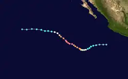 A small disturbance coincident with a tropical wave was first identified south of Acapulco on August 19.[4][5] The system moved west and coalesced into a tropical depression around 18:00 UTC on August 23.[6] The depression failed to intensify over subsequent days, and in fact, it was operationally downgraded back to a disturbance on August 26.[5] In the official database, the cyclone maintained its status and eventually intensified into Tropical Storm Miriam around 00:00 UTC on August 27.[6] Miriam turned west-southwest and entered the Central Pacific,[5] where it intensified into a hurricane at 12:00 UTC on August 28 and reached peak winds of 90 mph (140 km/h) twelve hours later.[6] Miriam then began to steadily weaken as it passed south of Hawaii,[5] and the cyclone dissipated after 00:00 UTC on September 2.[6]