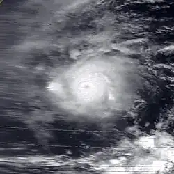 To the east of Tropical Storm Bud, a new tropical disturbance – originating as a Caribbean ITCZ disturbance – was identified south of Acapulco, Guerrero, on June 15.[4] The comparatively small system became a tropical depression around 06:00 UTC on June 17 and Tropical Storm Carlotta eighteen hours later while it moved over warm ocean waters.[5][6] After formation, Carlotta embarked toward the west-southwest, steered by the same ridge that directed Bud. The storm displayed a small eye in satellite imagery early on June 19,[5] and it was upgraded to a hurricane by 06:00 UTC that day.[6] Carlotta continued to intensify as it curved west-northwest,[5] becoming the season's first major hurricane around 06:00 UTC on June 20 and ultimately peaking as a Category 4 hurricane with winds of 130 mph (210 km/h) by 12:00 UTC on June 21.[6] Carlotta maintained its strength for a time before it encountered cooler waters and dry air on June 23.[5] The cyclone steadily lost strength and degenerated to a disturbance after 18:00 UTC on June 25 but remained a traceable entity as it moved across the Central Pacific. The disturbance moved across the Hawaiian island chain on June 28 and continued west, ultimately merging with a cold-core low after crossing the International Date Line. It was last identified over the West Pacific near Minami-Tori-shima on July 10.[7]