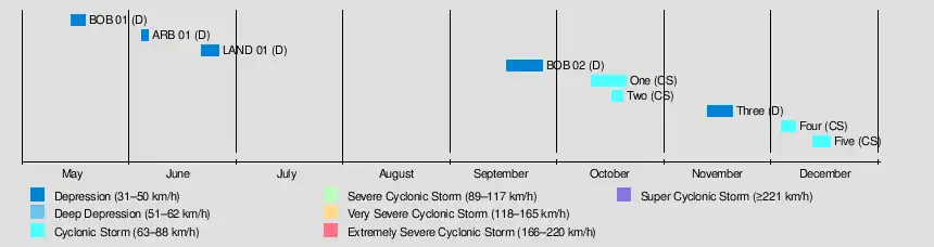 There were 14 depressions during the season. The first depression lasted from May 15–19, moving from the central Bay of Bengal eastward to the Nicobar Islands. The second depression existed from June 4–6 off the west coast of India. On June 21, a land depression developed over central India, moving offshore into the Arabian Sea and dissipating on June 26. There were three land depressions in August, as well as one in September. Another depression developed in the northern Bay of Bengal on September 16 and moved northwestward through India, dissipating on September 26. Another depression developed in the Bay of Bengal on October 1, striking Bangladesh three days later. On October 14, a depression developed in the central Arabian Sea and moved westward, passing near Socotra on October 17; it moved into the Gulf of Aden a day later.[3]