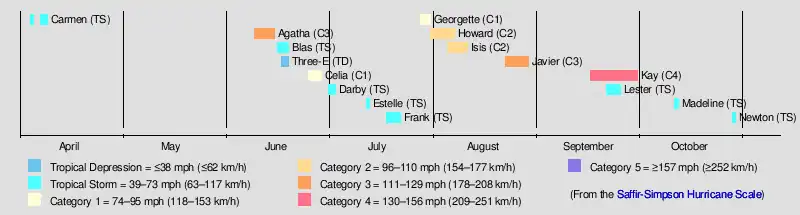 Overall, the 1980 season was slightly below the long-term average, with 16 tropical cyclones forming. Of those, 15 were named, 7 reached hurricane intensity, and only 3 became major hurricanes by attaining category 3 status or higher on the Saffir–Simpson scale.[3] All eastern Pacific systems this year formed in the eastern Pacific proper and two storms crossed into the central Pacific: Carmen from the west and Kay from the east.[4] The season had an early start when Carmen crossed over the International Date Line in April.[4] The strongest storm of this season is Hurricane Kay, peaking at 140 mph (225 km/h). Kay lasted for fourteen and a half days, which was the fifth-longest-lasting Pacific hurricane at the time.