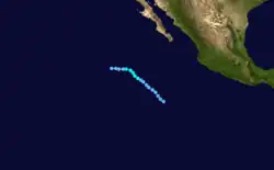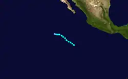 A tropical disturbance south of Acapulco developed into a tropical depression on September 16 and a tropical storm later that day. Kay headed in an irregular but generally west-northwest path out to sea. Kay strengthened into a hurricane on September 17. It continued strengthening and reached its peak as a Category 4 hurricane on the Saffir–Simpson scale on September 18. Kay then slowly weakened and was a tropical storm by September 20. Kay's forward motion slowed as it neared the central Pacific. It restrengthened into a hurricane on September 23, crossed 140°W, and entered the Central Pacific Hurricane Center's area of responsibility the next day.[2] Kay executed a small anticyclonic loop, and then began weakening again. It became a tropical storm again on September 27, and a depression two days later. The cyclone dissipated on September 30 while located north of the Hawaiian Islands.[4] Kay did not effect land, causing no damage or casualties.[2] It was the strongest tropical cyclone of the season at 140 mph (225 km/h). Kay lasted for 14.5 days, enough to make it the fifth-longest-lasting Pacific hurricane at the time.[4]